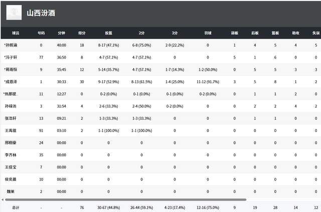 山西队3人得分上双,成恩泽空砍30分8篮板,孙照涵18分5篮板4助攻,蒋雨恒12分5篮板3助攻。